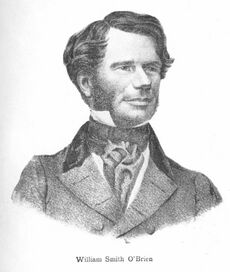 The Young Ireland movement culminated in a failed uprising (see Young Irelander Rebellion of 1848), which, influenced by the French Revolution of 1848 and further provoked by government inaction during the Great Famine and the suspension of habeas corpus,[28] which allowed the government to imprison Young Irelanders and other political opponents without trial, was hastily planned and quickly suppressed. Following the abortive uprising, several rebel leaders were arrested and convicted of sedition. Originally sentenced to death, Smith O'Brien and other members of the Irish Confederation were transported to Van Diemen's Land.[29]