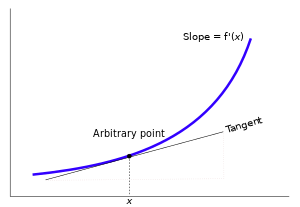 Tangent line at (x, f(x)). The derivative f′(x) of a curve at a point is the slope (rise over run) of the line tangent to that curve at that point.