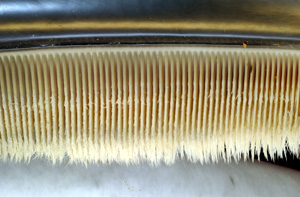 Adult right whales are typically 13–16 m (43–52 ft) long. They have extremely thick bodies with a girth as much as 60% of total body length in some cases. They have large, broad and blunt pectoral flippers and the deeply notched, smoothly tipped tail flukes make up to 40% of their body length. The North Pacific species is on average the largest of the three species. weigh 100 short ton (91 t; 89 long ton). The upper jaw of a right whale is a bit arched, and the lower lip is strongly curved. On each side of the upper jaw are 200–270 baleen plates. These are narrow and approximately 2–2.8 m (6.6–9.2 ft) long, and are covered in very thin hairs.[27] Right whales have a distinctive wide V-shaped blow, caused by the widely spaced blowholes on the top of the head. The blow rises 5 m (16 ft) above the surface.[28]
