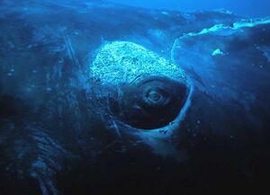 The skin is generally black with occasional white blotches on the body, while some individuals have mottled patterns.[27] Unlike other whales, a right whale has distinctive callosities (roughened patches of skin) on its head. The callosities appear white due to large colonies of cyamids (whale lice).[12][29] Each individual has a unique callosities pattern. In 2016, a competitive effort resulted in the use of facial recognition software to derive a process to uniquely identify right whales with about 87% accuracy based on their callosities.[30] The primary role of callosities has been considered to be protection against predators. Right whale declines might have also reduced barnacles.[31]