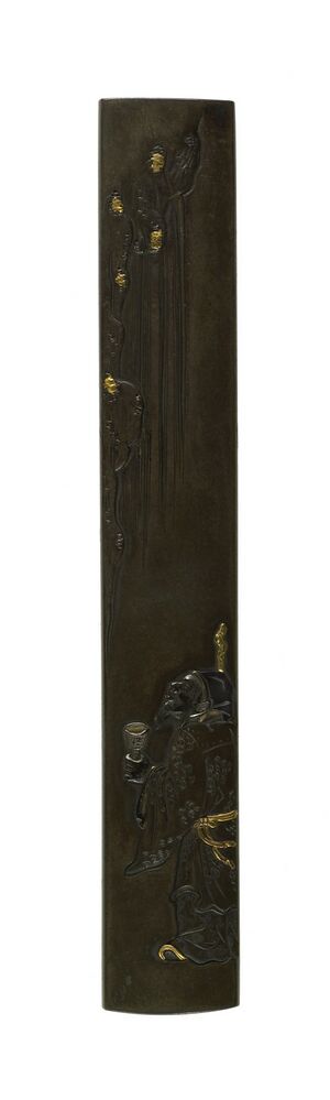Kozuka with Li Bai drinking a cup of wine while looking at a waterfall