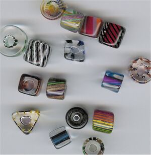 - وهناك عدة طرق لصهر قطع الزجاج معا لتشكيل نموذج متعدد الالوان والنتيجة هي قطع خرز ميليفيوري أو خرز شيفرون.ومن هذه التقنيات: