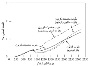يبين شكل 15 منحنيات التمدد الحرارى لعدد من طوب المغنسيت-كربون. خلال مدى درجات الحرارة 370-540 ْم، حيث يعمل تكوُّن رابط كربونى زجاجى إلى تكثيف بنية المادة وينتج عن ذلك انكماشات. وفى المواد التى تحتوى على فلزات تحدث تفاعلات تمددية في درجات الحرارة المرتفعة، فالطوب المحتوى على مغنسيوم يُظْهِر تمدداً حرارياً هائلاً في المدى 540-705 ْم، وتظهر المواد التى تحتوى على ألومنيوم تسارعاً تدريجياً في التمدد فوق نحو 760 ْم، ويزداد التمدد الحرارى في درجات الحرارة العالية بدرجة كبيرة مع الزيادة في محتوى الفلزات. وبعد التسخين إلى 1430 ْم يُظْهِر طوب المغنسيت-كربون تمدداً دائماً من 0,1 إلى 1,0 ٪.