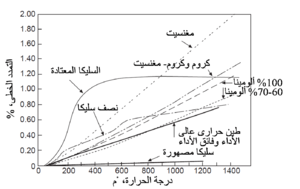جميع الحراريات تتمدد عند التسخين بطريقة مرتبطة بتركيباتها الكيميائية. يظهر شكل 12 أمثلة تقليدية على تمدد أنواع متباينة من الحراريات، ومن الواضح أن شكل منحنى التمدد ودرجة الحرارة والسعة القصوى للتمددات تختلف على نحو ملحوظ بين هذه المواد. تستخدم المواد القابلة للانضغاط والفجوات للتخلص من التمدد في أى بناء حرارى، لأنه من الواضح أن البطانة الحرارية يمكن أن تعانى نمواً يصل إلى عدة بوصات بسبب التمدد، ومن ثم فلابد من التخلص منه. الحراريات ذات التمدد الحرارى الخطى أو القريب من الخطى تتطلب عموماً عناية أقل بكثير من تلك التى لها تمدد غير خطى. والمثال التقليدى للحراريات التى تتطلب عناية أثناء التسخين الصاعد هو طوب السليكا، الذى يتكون بعد الحرق من موازنة مسيطر عليها بعناية بين أشكال معدنية مختلفة للمركب SiO2. يظهر شكل 13 التمدد الحرارى للأشكال المعدنية المختلفة للسليكا، التى تجعل التسخين ببطء لازماً خلال نطاقات حرجة مختلفة من درجة الحرارة. ونتيجة للتركيب المعدنى المعقد لطوب السليكا، تسخن المنشآت الكبيرة التى تستخدم هذه الطوب (مثل أفران الكوك) وتبرد بمعدلات بطيئة للغاية، وربما تتطلب عدة أسابيع للوصول إلى درجات حرارة التشغيل، وبمجرد تجاوز درجة الحرارة الحرجة، يُظْهِر طوب السليكا تمدداً حرارياً منخفضاً ومنتظماً، ويمكن تدويره حرارياً دون ضرر بين 1000-1538 ْم.