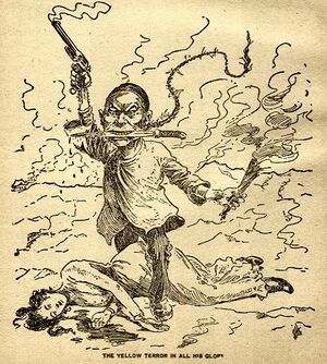 In Los Angeles, Yellow Peril racism provoked the Chinese massacre of 1871, wherein 500 white men lynched 20 Chinese men in the Chinatown ghetto. Throughout the 1870s and 1880s, the leader of the Workingmen's Party of California, the demagogue Denis Kearney, successfully applied Yellow Peril ideology to his politics against the press, capitalists, politicians, and Chinese workers,[30] and concluded his speeches with the epilogue: "and whatever happens, the Chinese must go!"[31][32] The Chinese people also were specifically subjected to moralistic panics about their use of opium, and how their use made opium popular among white people.[33] As in the case of Irish-Catholic immigrants, the popular press misrepresented Asian peoples as culturally subversive, whose way of life would diminish republicanism in the U.S.; hence, racist political pressure compelled the U.S. government to legislate the Chinese Exclusion Act (1882), which remained the effective immigration-law until 1943.[4] Moreover, following the example of Kaiser Wilhelm II's use of the term in 1895, the popular press in the U.S. adopted the phrase "yellow peril" to identify Japan as a military threat, and to describe the many emigrants from Asia.[34]