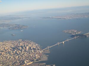 San Francisco is in the foreground in this picture looking north. San Pablo Bay continues north surrounded by parts of (left to right) Marin, Sonoma, Solano and Napa Counties.