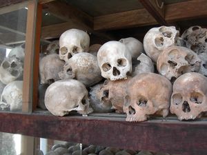 تعتبر منظمة الخمير الحمر المسؤولة عن موت 1.5 مليون شخص (أحيانا يقدرون بين 850,000 إلى 3 مليون) في ظل نظامهم، عن طريق الإعدام، والتعذيب والأعمال الشاقة travail forcé. حاول زعيمهم پول پوت تطبيق نوع راديكالي متشدد من الشيوعية الزراعية communisme agraire حيث يجبر كامل المجتمع على نوع من الهندسة الاجتماعية تجبرهم على العمل في مجتمعات زراعية أو في أعمال شاقة.