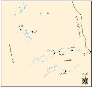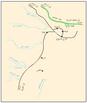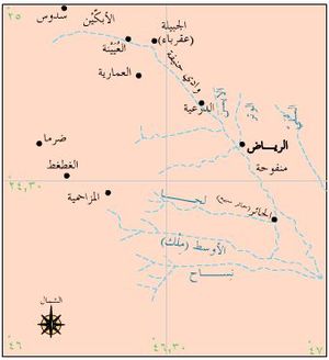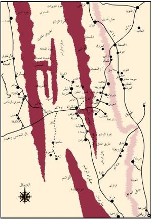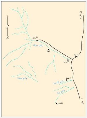 - ^ وادي حنيفة يمتد بشكل متعرج من الشمال الغربي إلى الجنوب الشرقي تحفه الجبال من جانبيه. وينبسط ويضيق حسب تكويناته الطبيعية وأرضه. وتغذيه في مواسم الأمطار روافد تنحدر من الجبال، وتكثر فيه المياه الجوفية التي تغذي بساتين النخيل والعنب والأشجار المتنوعة ممتدة من العمارية والملقى في شمال الدرعية حتى الحائر (حائر سبيع) في الجنوب منها.