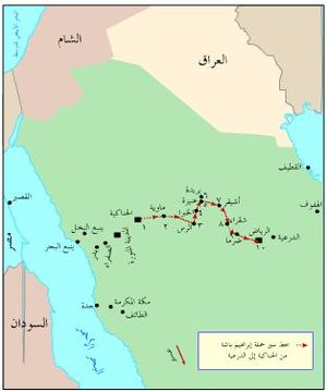 حتى ذلك الحين كان عبد العزيز يتربع منذ ثماني سنوات على عرش الدرعية التي كانت أكبر شأنا بقليل من سائر الدويلات العديدة في الجزيرة العربية. إلا أن الوهابيين حصلوا على قاعدة متينة لمواصلة توسيع دولتهم. | ![]() |