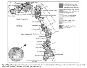 Map of the study region showing place names mentioned in the text and proportion of effort-years wolves were known to be present in 20 areas of east and north Greenland, 1978–1998.[1]