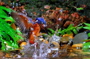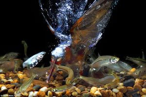 His striking photographs show a family of kingfishers diving into water to hunt.