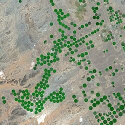 عندما بدأت الزراعة الحديثة المكثفة، كان هناك حوالي 500 كيلومتر مكعب من المياه تحت الصحراء السعودية. ولكن في السنوات الأخيرة، يقدر أن نحو 21 كيلومتراً مكعباً يتم ضخه إلى السطح سنويًا للاستخدام في المزارع. لا يتم تعويض هذه الكميات بالأمطار لأنها شديدة الندرة. بناءً على دراسة أجريت عام 2004 كان السعوديون في طريقهم نحو استخدام ما لا يقل عن 96 ميلاً مكعباً (400 كيلومتر مكعب) من المياه الجوفية بحلول عام 2008. يقدر الخبراء أن أربعة أخماس المياه الجوفية السعودية قد استهلكت.[26][27]
