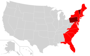 خريطة الساحل الشرقي للولايات المتحدة. ڤرمونت، پنسلڤانيا، ومنطقة كلومبيا (مارون داكن) لا يتضمن خط الساحل الفعلي، ولكن يشيع اعنبارها جزء من منطقة الساحل الشرقي.