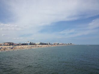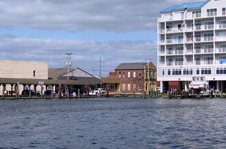 Ocean City's skyline, containing tall hotels and condominiums, stands out within Delmarva. At the southern end of the town, a recreational boardwalk spans over thirty blocks, containing carnival rides and games, restaurants, bars, arcades, and clothing boutiques.