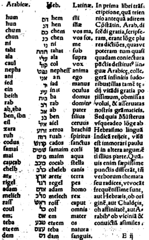 - ^ أ ب ت ث Ruhlen, Merritt (1991), A Guide to the World's Languages: Classification, Stanford University Press, ISBN 9780804718943, https://books.google.co.uk/books?id=mYwmDE3f6wUC&pg=PA77#v=onepage&q&f=false, "The other linguistic group to be recognized in the eighteenth century was the Semitic family. The German scholar Ludwig von Schlozer is often credited with having recognizes, and named, the Semitic family in 1781. But the affinity of Hebrew, Arabic, and Aramaic had been recognized for centuries by Jewish and Islamic scholars, and this knowledge was published in Western Europe as early as 1538 (انظر پوستل 1538). Around 1700 هيوب لودولف، who had written grammars of Geez and Amharic (both Ethiopic Semitic languages) in the seventeenth century, recognized the extension of the Semitic family into East Africa. Thus when فون شلوتسر named the family in 1781 he was merely recognizing genetic relationships that had been known for centuries. Three Semitic languages (Aramaic, Arabic, and Hebrew) were long familiar to Europeans both because of their geographic proximity and because the Bible was written in Hebrew and Aramaic."