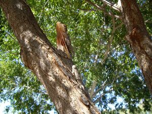 These lizards are more active during the wet season, when they select smaller trees and are more commonly seen near the ground; during the dry season, they use larger trees and are found at greater heights.[22] Frilled lizards do not enter torpidity during the dry season, but they can greatly reduce their energy usage and metabolic rate in response to less food and water.[23] Body temperatures can approach 40 °C (104 °F).[10] The species will bask vertically on the main tree trunk in the morning and near the end of the day,[10][24] though in the dry season they cease basking at a lower body temperature to better maintain energy and water.[24][25] When it gets hotter during day, they climb higher in the canopy for shade.[10] Frilled lizards will use large trees and termite mounds as refuges during wildfires. After a forest is burnt, the lizards select trees with more continuous canopies.[20]