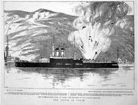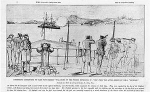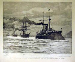 رسم كما ظهر في ذا گرافـِك The Graphic في 13 مارس 1897 لسفن حربية من السرب الدولي يقصف المتمردون المسيحيون فوق خانيا، كريت، في 21 فبراير 1897. ولعلها معكوسة. | |