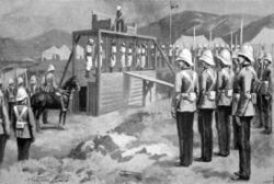 The British took custody of the first men accused of murder on 14 September and moved swiftly, trying those accused of killing British military personnel in courts martial and those accused of killing British civilians before a British military tribunal. Twelve men were convicted of murdering British soldiers and five of murdering British civilians, and all 17 of the men were sentenced to death by hanging. Held aboard the British protected cruiser إتشإمإس Isis while awaiting their trials and executions, the men were hanged publicly in prominent locations. The first seven men convicted of murdering British military personnel were hanged on 18 October,[51] and the final five on 29 October,[51] and the five men convicted of murdering British civilians were hanged on 5 November.[52] Two men convicted under Italian jurisdiction of murdering Cretan civilians were executed by a firing squad composed of three men from each of the four powers.[19][48] on 23 November,[52] after which use of the death penalty for killers of Christian civilians was dropped.[53]