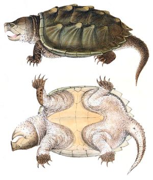 1. ^ أ ب Tortoise & Freshwater Turtle Specialist Group (1996). Macrochelys temminckii. In: IUCN 2013. IUCN Red List of Threatened Species. Version 2013.2.