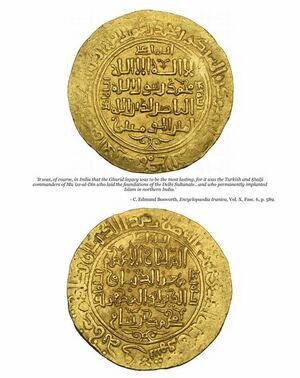 1. ^ Encyclopaedia Iranica, "Ghurids", C.E. Bosworth, (LINK): "... The Ghurids came from the Šansabānī family. The name of the eponym Šansabānasb probably derives from the Middle Persian name Wišnasp (Justi, Namenbuch, p. 282). [...] Nor do we know anything about the ethnic stock of the Ghori's in general and the Sansabanis in particular; We can only assume that they were eastern Iranian Tajiks ... The sultans were generous patrons of the Persian literary traditions of Khorasan, and latterly fulfilled a valuable role as transmitters of this heritage to the newly conquered lands of northern India, laying the foundations for the essentially Persian culture which was to prevail in Muslim India until the 19th century. ..."
