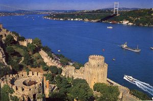 مضيق البسفور: البوسفور، هو مضيق يصل بين البحر الأسود وبحر مرمرة، ويعتبر مع مضيق الدردنيل الحدود الجنوبية بين قارة آسيا وأوربا، ويبلغ طوله 30 كم، ويتراوح عرضه بين (550 متر و 3000 متر)، وحسب المعتقدات اليونانية القديمة، فإن تسمية المضيق تعني ممر البقرة. مياه مضيق البوسفور مصنفة ضمن مجال الملاحة الدولية، وتعتبر حركة السفن بالمضيق واحدة من أهم نقاط الملاحة البحرية في العالم، حيث بلغ عدد السفن المارة بالمضيق سنة 2003 حوالي 47,000 سفينة منها أكثر من 8000 سفينة تحمل مواد خطيرة (غاز مسال، بترول … الخ)، وفي سنة 2004 تزايد عدد السفن المارة بالمضيق ووصل عددها أكثر من 53,000 سفينة. يخترق المضيق تيارات مائية خطيرة، وضيق المضيق في بعض المناطق يجعل من الملاحة صعبة ، وقد وقعت العديد من الحوادث الخطيرة، نذكر منها حادث تصادم سفينتين محملتين بالبترول في 13 مارس 1994 أدت إلى وفاة 25 بحار، وفي 15 يوليو 2005، باخرة بانامية غرقت بالمضيق في ظروف غامضة.[2]