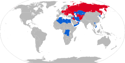 خريطة لمستخدمي سكود بالأزرق، والمشغلين السابقين بالأحمر.