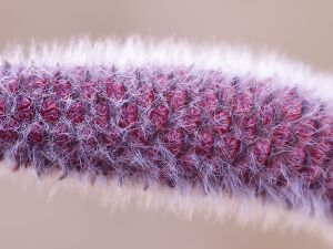 The staminate (male) flowers are without either calyx with corolla; they consist simply of stamens, varying in number from two to 10, accompanied by a nectariferous gland and inserted on the base of a scale which is itself borne on the rachis of a drooping raceme called a catkin, or ament. This scale is square, entire, and very hairy. The anthers are rose-colored in the bud, but orange or purple after the flower opens; they are two-celled and the cells open latitudinally. The filaments are threadlike, usually pale brown, and often bald.