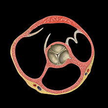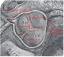 مقطع عرضي للصمام الأبهري، يُظهر الشرف الثلاث منغلقة، كما يُظهر مخرج الشريان التاجي الأيسر فقط.