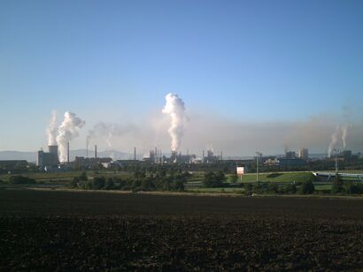 Integrated steel mill in the Netherlands. The two massive towers are blast furnaces.