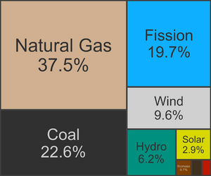 The following figures offer detail into the sources of generation used in each state.[51] Most often, natural gas is the largest source in a given state, with 22 states using it more than any other. Among renewable sources, 18 states use wind power more than any other.