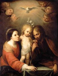 العائلة المقدسة Holy Family، تتكون من المسيح طفلا، مريم العذراء، ويوسف النجار. The subject became popular in art from the 1490s on,[1] but veneration of the Holy Family was formally begun in the 17th century by Saint François de Laval, the first bishop of New France, who founded a confraternity.
