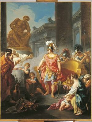 - ^ آريان، Anabasis Alexandri (Αλεξάνδρου Ανάβασις), Book ii.3): "καὶ τὴν ἅμαξαν τοῦ πατρὸς ἐν τῇ ἄκρᾳ ἀναθεῖναι χαριστήρια τῷ Διὶ τῷ βασιλεῖ ἐπὶ τοῦ ἀετοῦ τῇ πομπῇ." والتي تعني "... وعرض عربة أبيه هدية للملك زيوس عرفاناً لإرساله النسر".