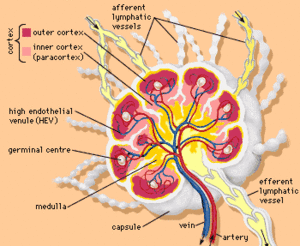 تعتبر العقد اللمفاوية مقر تخزين وتكاثر للخلايا المناعية ولها دور مهم مع الجهاز اللمفي في نقل وتشكيل كريات الدم البيضاء وخصوصا اللمفاويات التائية والبائية.وهي أيضا محطات تصفية وتنقية للدم الوارد من الأنسجة والحامل لبقايا الالتهاب والخلايا الميتة.