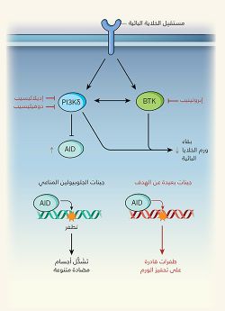 يقوم عقار "إبروتينيب" بتثبيط إنزيم يُعرف باسم BTK. وفي مسارات تأشير مستقبِلات الخلايا البائية الأكثر ذكرًا، يعمل إنزيم BTK في مرحلة لاحقة بعد PI3Kδ، ولا يُعتقد أنه يشارك في المسار الذي ينظم التعبير عن إنزيم AID. ومع ذلك.. تشير دراسات إلى أن الإنزيمين PI3Kδ وBTK يعملان معًا في مركّب كبير متعدد البروتينات، ويدعمان نشاط بعضهما البعض13. وقد لاحظ كومبانيو وزملاؤه أن تثبيط إنزيم BTK بواسطة عقار "إبروتينيب" قد خفَّض نشاط إنزيم PI3Kδ (الذي تتحكم فيه عملية فسفرة بروتين AKT)، وزاد تعبير إنزيم AID في الخلايا البائية. وبالمقارنة بالعلاج بواسطة مثبطات PI3Kδ، لُوحِظ أن عقار "إبروتينيب" أدَّى أيضًا إلى زيادات في التطفر الجينومي في الحمض النووي، وفي أحداث إعادة التركيب، وإنْ كان ذلك بدرجة أقل.