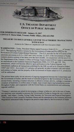 وفي 13 يناير 2017، قام الرئيس الأمريكي باراك أوباما بإلغاء العقوبات على السودان بدءاً من 13 يوليو 2017. لمدة عام، على أن يُجدد الإلغاء سنوياً بعد مراجعة من الحكومة الأمريكية لإلتزام السودان بالتعاون في مكافحة التطرف الإسلامي والهجرة غير الشرعية ومواصلة الدور البناء في قضايا دارفور وجنوب السودان ومكافحة جيش الرب للمقاومة ومساعدة الحرب السعودية على اليمن.