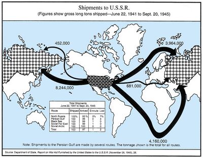 Roughly 17.5 million tons of military equipment, vehicles, industrial supplies, and food were shipped from the Western Hemisphere to the Soviet Union, with 94 percent coming from the United States. For comparison, a total of 22 million tons landed in Europe to supply American forces from January 1942 to May 1945. It has been estimated that American deliveries to the USSR through the Persian Corridor alone were sufficient, by US Army standards, to maintain sixty combat divisions in the line.[62][63]