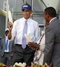 أوباما ممسكاً بكوز ذرة في مهرجان زراعي في أديس أبابا، 28 يوليو 2015.
