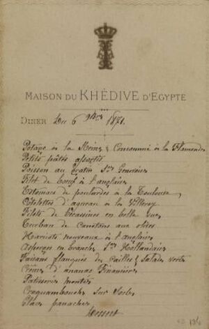 في تلك الليلة، أخذ دوم پدرو الثاني ودونا تريزا كريستينا عينات من فخامة البلاط العثماني. تمت دعوتهم لتناول العشاء في منزل الخديوي إسماعيل حيث تضمنت القائمة 15 طبقًا، بما في ذلك سمك الگراتين جنڤواسيس، وشرائح لحم البقر على الطريقة الإنجليزية، والهليون في صلصة هولانديز.