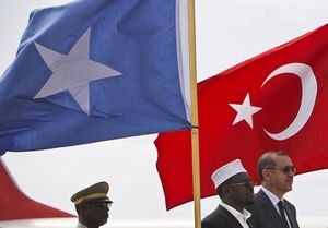 في الفترة ما بين 21-23 مايو 2010 استضافت تركيا مؤتمر الصومال الذي عقدته الأمم المتحدة في إسطنبول.[16] وبعد أن غادرت معظم فرق الإغاثة التابعة للأمم المتحدة بلاد الصومال بدعوى خوفهم من الحرب الأهلية ونكبة المجاعة، ظهرت المساعدة التركية في الصومال، وجندت مئات الأتراك للعمل على إنقاذ البلاد وإغاثتها. وقام رئيس الوزراء التركي رجب طيب أردوغان بزيارة مقديشيو خلال 2011، في رحلة تاريخية مصطحباً فيها عائلته ومستشاريه لتفقد ضحايا مجاعة الصومال، واعتبرت أول زيارة لزعيم غير أفريقي للصومال منذ 20 عاماً،[17] أعلن خلالها أردوغان إعادة فتح سفارة تركيا في الصومال, كما جمع أكثر من 350 مليون دولار من تركيا لإعادة إعمار المستشفيات والمدارس فضلا عن إرسال الطلاب الصوماليين إلى تركيا لحصولهم على منح دراسية.[18] وأعلنت منظمة الهلال الأحمر التركية بدأ مشروع بناء وتأسيس مدارس مهنية في العاصمة الصومالية مقديشو، لتدريب الطلاب الصوماليين على حرف مختلفة كإصلاح السيارات والكهرباء وغيرها.
