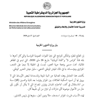 - ^ "وزير الخارجية الفرنسي: الجزائريون هم وحدهم من يستطيعون ترجمة "تطلعات" الحراك". فرانس 24. 2020-10-16. Retrieved 2020-10-16.