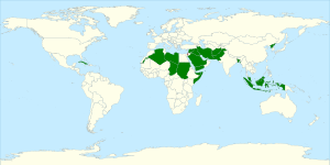 الجزائر; تشاد(1960–1972); جزر القمر; جيبوتي; غينيا(1959–1967); ليبيا; مالي(1960–1973); المغرب(1994–2000); موريتانيا[12] (2000–2009); Niger (1960–1973, 1996–2002); Somalia; Sudan; and Tunisia[13] (1996–2000), all of which have a Muslim majority.