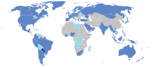Since the 1970s, the PRC and ROC have competed for diplomatic recognition from nations across the world, often by offering financial aid to poorer countries as an inducement.[69][70] As a precondition for diplomatic relations, the PRC requires that the other country renounce any recognition of the ROC. Since the introduction of the "pragmatic diplomacy" (務實外交; Wùshí wàijiāo) policy in 1991, the ROC has not insisted on consideration as the sole representative of China, and does not require nations that recognize it to end their relations with the PRC.[71] For example, when Saint Lucia chose to recognize the ROC in 2007, Foreign Minister Rufus Bousquet said the decision "should not be construed as a severance of our relationship with the PRC".[72] However, the PRC responds to foreign recognitions of the ROC by suspending relations with the other country.[71]
