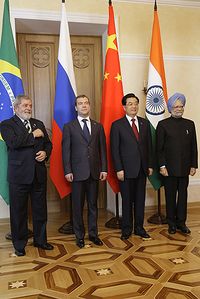 وعلى جانب آخر شكلت البرازيل مع روسيا والصين والهند مجموعة (البريكس BRICS) في 2009 ثم انضمت لهم جنوب أفريقيا في 2010. ويعتبر تجمع لخمس دول تعد صاحبة اكبر اقتصاديات على مستوى الدول النامية، حيث يعادل الناتج الإجمالي المحلى لتلك الدول مجتمعة ناتج الولايات المتحدة. وقد قام هذا الكيان على أساس أطروحة مفادها انه بحلول 2050 ستنافس اقتصاديات تلك الدول اقتصاد أغنى دول العالم. وهى على اى حال تشكل واحدة من اكبر الأسواق العالمية وأسرع الاقتصاديات نموا في العالم.
