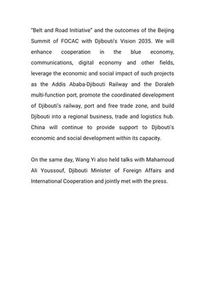 في اليوم نفسه، أجرى وانگ يي أيضاً محادثات مع محمد علي يوسف، وزير الشؤون الخارجية والتعاون الدولي في جيبوتي وعقداً مؤتمراً صحفياً مشتركاً.