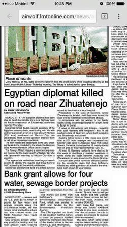 خبر مقتل الدبلوماسي المصري بالمكسيك، في حادث سرقة على الطريق بالقرب من زيهواتنخو، في 20 نوفمبر2002.