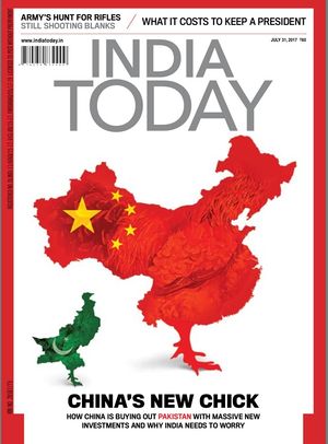وفي 28 يوليو 2017، أفادت صحيفة الشعب الصينية أن الرأي العام الصيني غاضب على غلاف إنديا توداي، المجلة الحكومية الهندية، الذي صوّر خريطة الصين، بدون التبت، على شكل دجاجة، وخريطة باكستان ككتكوت يسير خلفها. المتحدث الرسمي باسم وزارة الخارجية الصينية يرفض التعليق. الهند تواصل استفزاز الصين، على أمل أن يعيد الرئيس الأمريكي ترمب منح فيزات العمل المؤقت H1 التي كانت تــُـمنح لنحو 100,000 هندي اضافي سنوياً. وقف تلك الفيزات يقتل صناعة تكنولوجيا المعلومات الهندية، التي هي قاطرة نمو الاقتصاد الهندي الكسيح.[14]