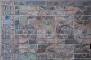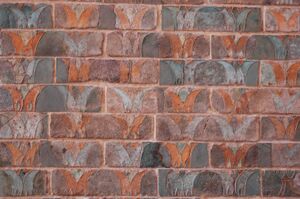 Intricate scenes depicting archers of king Darius would decorate the walls, as well as motifs of nature such as double-bulls, unicorns, fasciae curling into volutes, and palms disposed as a flower or a bell. The archers in particular depict a unique symbiosis of Persian, Ionian and Greek artistry of the time probably reflecting the origin of the artists who were originally hired by Darius the Great, and their personal reflections on the finished work.[30] Perhaps the most striking terra-cotta relief is that of the griffin, depicting a winged creature resembling a lion with wings of an eagle (picture not shown here). The terra-cotta brick reliefs were decorated with lively dye colorations often giving them a lifelike quality.