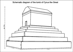 After his death, Cyrus the Great's remains were interred in his capital city of Pasargadae, where today his limestone tomb (built around 540–530[9]) still exists. The translated ancient accounts give a vivid description of the tomb both geometrically and aesthetically; "With its massive stonework and smooth surfaces relieved by the minimum of decorative detail, the tomb creates an impression of dignity, simplicity, and strength. In design it combines two distinct elements: a high plinth composed of six receding tiers and a modest, gabled tomb chamber. In its original state the tomb probably measured c. 11,1 o m from the once hidden foundation level to the apex of the roof. Of the six tiers of the plinth, the lowest has an average height of 1,65 m, the second and third have a height of 1,05 m, and the last three each have a uniform height of 57,5 cm. The base of the plinth measures c. 13,35×12,30 m, while the base of the tomb chamber measures c. 6,40 × 5,35 m. As for the cella's other measurements, the narrow doorway, in its present condition without its original doorsills, is 1,39 m high and 78 cm wide; the passage is 1,20 long; and the chamber is 3,17 m in length with a uniform width and height of 2,11 m. The walls of the chamber are up to 1,50 m thick. Above the chamber, a hollow compartment in the roof, almost divided in two for structural reasons, measures 4,75 m in length and 85 cm in height. The capstone of the roof is missing."[10]