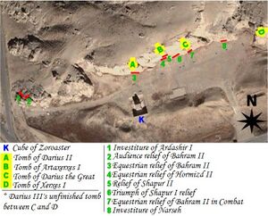 Naqsh-e Rostam is an archaeological site located about 6 kilometers northwest of Persepolis in the Marvdasht region of Fars province, Iran.[34] Nash-e Rostam acts as a necropolis for the Achaemenid kings, but is a significant historical entity in that it also housed ancient Elamite relief, as well as later relief by the Sasanian kings. Naqsh-e Rostam is not the actual name of this massive structure, but is the New Persian compound word composed of "Naqsh" meaning "face", or "facade", and "Rostam" referring to the hero of the Persian epic Shahnameh. The Elamites, Achaemenids, and Sasanians lived centuries before the drafting of the Shahnameh by the Persian poet Ferdowsi, and therefore the name is a misnomer, the result of the great amnesia of Persians about their ancient past, that settled over them after being conquered by the Arabs.[35]