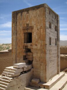 One of the enigmatic features of the complex is a cubical, stone structure standing 12.5 meters tall, and around 7 meters wide, called the "Ka'ba-ye Zartosht" translating to the "Cube of Zoroaster" believed to have been constructed during the Achaemenid era and modified and changed during the Sassanid era. The structure is cubical in base, with blind impressions on the side resembling windows, and a ruined staircase leading to a small door in the front leading to a completely empty interior.[34][35] There are varied speculations as to its function discussed below.